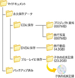 2.あとあとの使いやすさやファイルサイズを考慮して、それらのデータを最終的に保存するのに適切な光学ディスクを決める。例えば、「永久保存データ」 フォルダの中に、「CD に保存」「DVDに保存」「ブルーレイに保存」というフォルダを作成し、サイズの小さいExelやWordのファイルが中心のフォ ルダは「CDに保存」に、画像ファイルのフォルダは「DVDに保存」に、動画ファイルのフォルダは「ブルーレイに保存」にというように決めて保存していき ます。